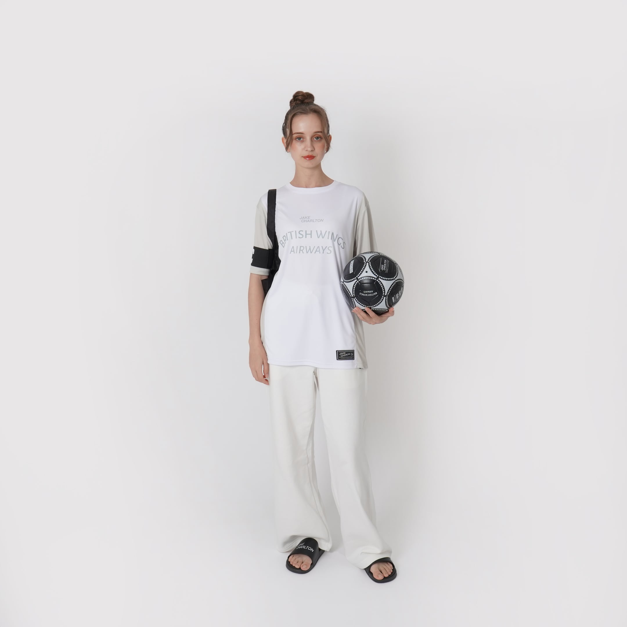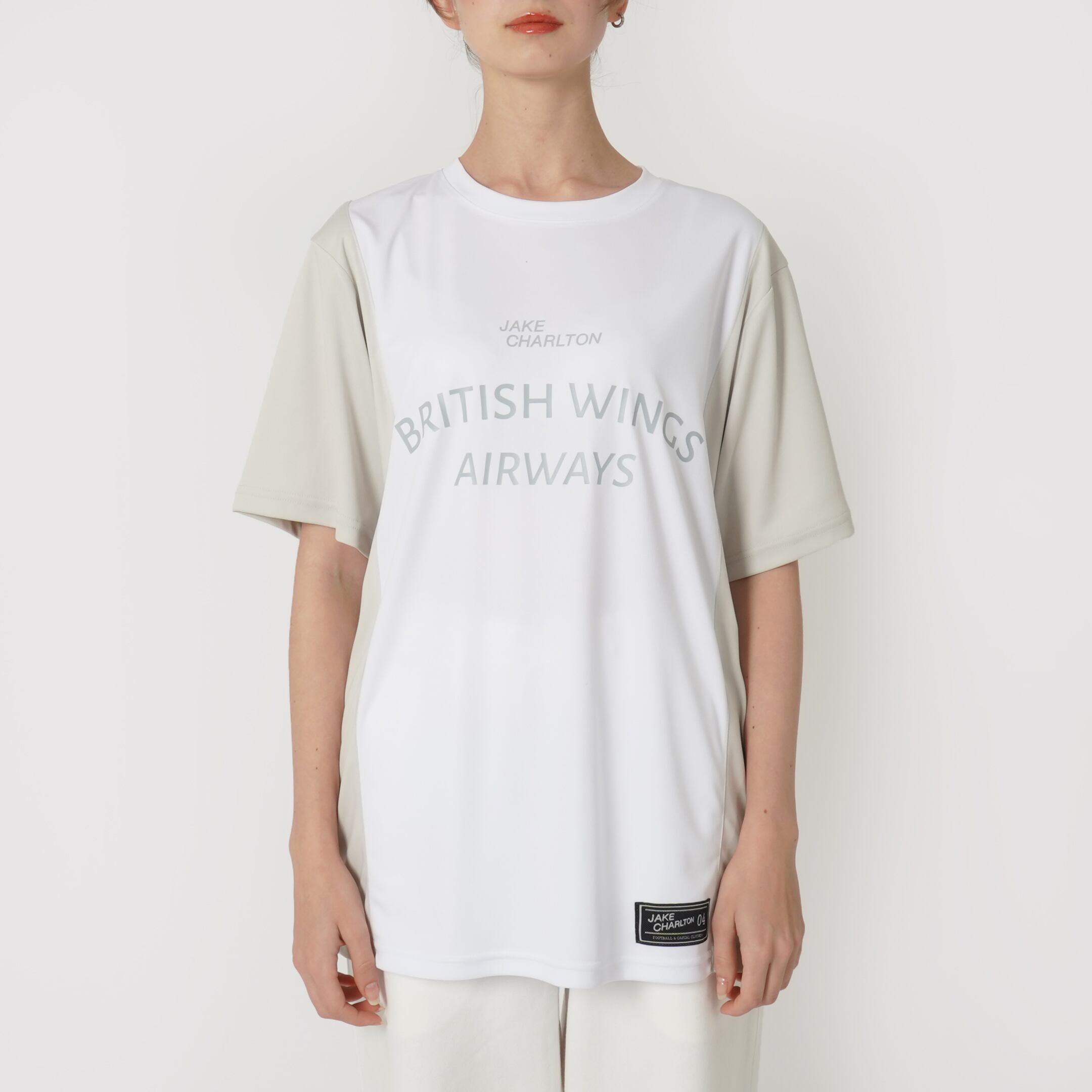 身頃の中央部分をホワイトとグレーの生地で繰り替え。胸元にはフィクショナルエアライン「BRITISH WINGS AIRWAYS」のプリントが施されています。