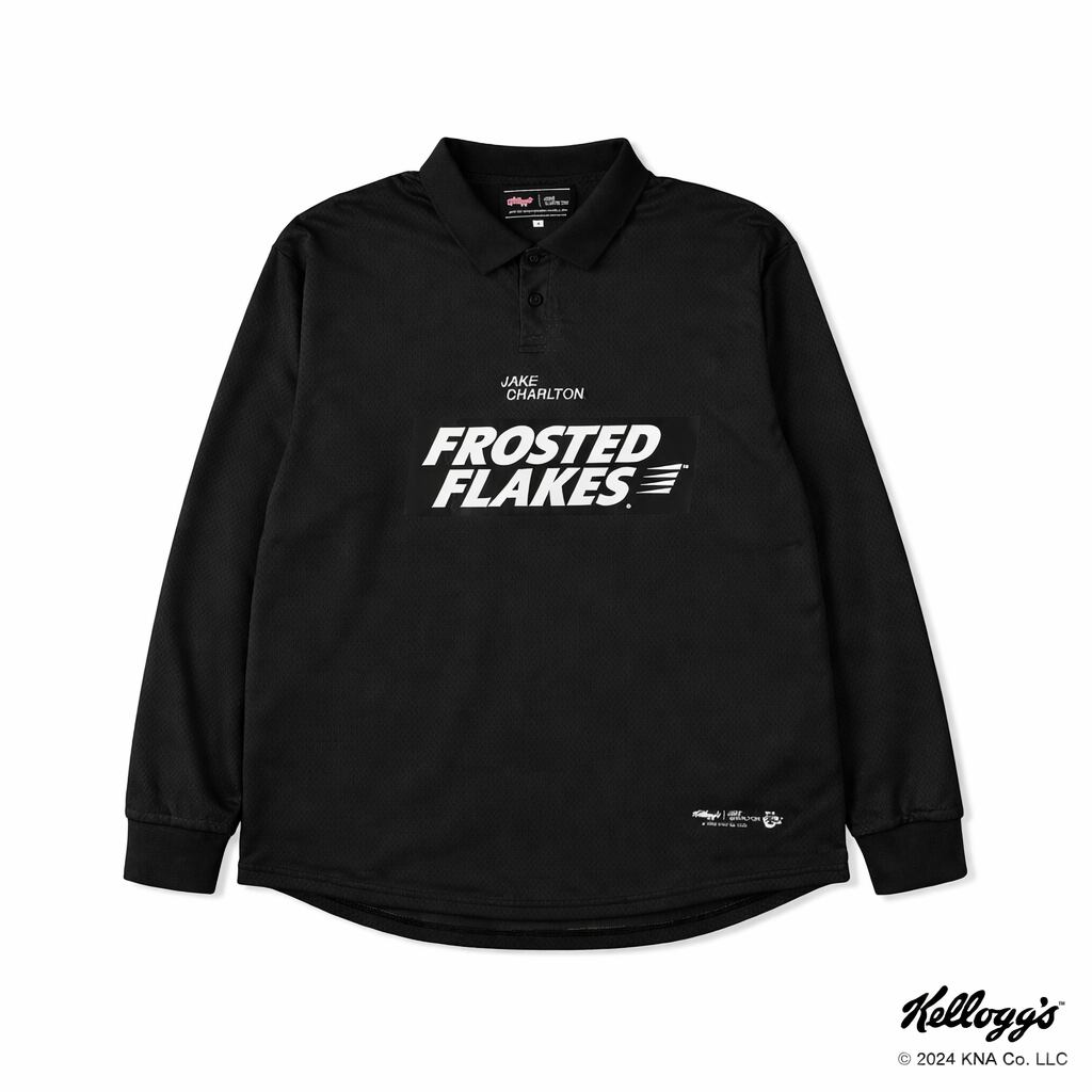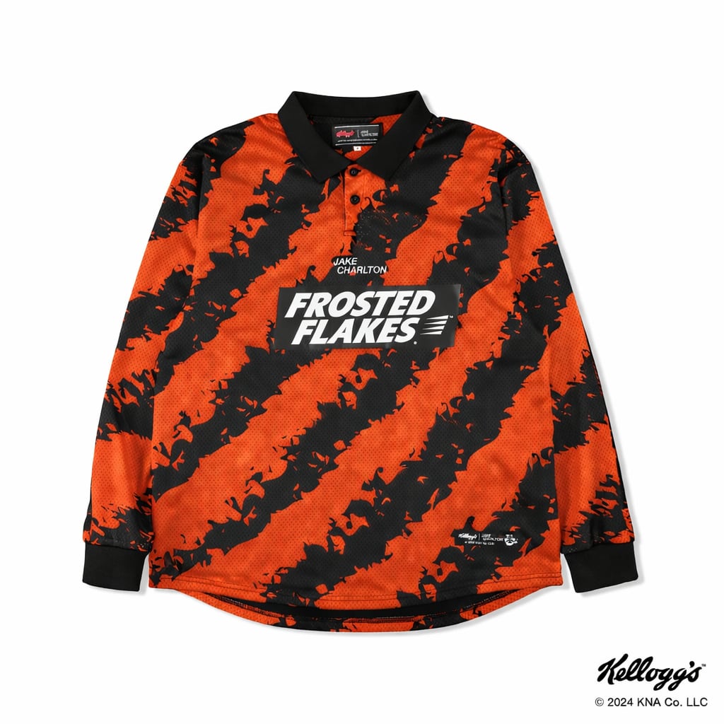 トニー・ザ・タイガーのグラフィックを大胆に用いたダブルメッシュのゲームシャツ。90年代前半に見られる小さめのクラシックな襟を細畝のリブで再現。メインスポンサーの枠にはKellogg'sシリアルの定番「FROSTED FLAKES」のレトロなロゴを設定しました。吸水速乾性に優れ、伸縮性があるマットなメッシュ生地を採用。数量限定で販売。